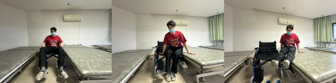 轮椅与床垂直→关闭手刹→分别将双腿抱起放于床上→打开手刹→将轮椅向前推进,紧靠床边→关闭手刹→双手放于扶手上→多次撑起上身将臀部向床上移动→摆正双下肢位置。
