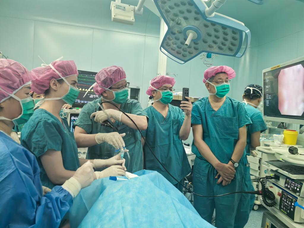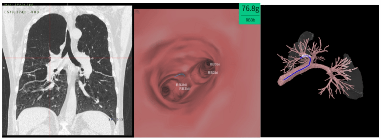 术中,在麻醉、内镜中心和手术室团队紧密配合下,根据CT定量分析,孙加源与呼吸一科介入团队经支气管镜对徐先生右肺上叶RB3相关肺气肿严重病变部位予以热蒸汽消融治疗,消融体积约1400ml。镜下评估消融充分,手术疗效评估良好。术后徐先生症状明显好转。