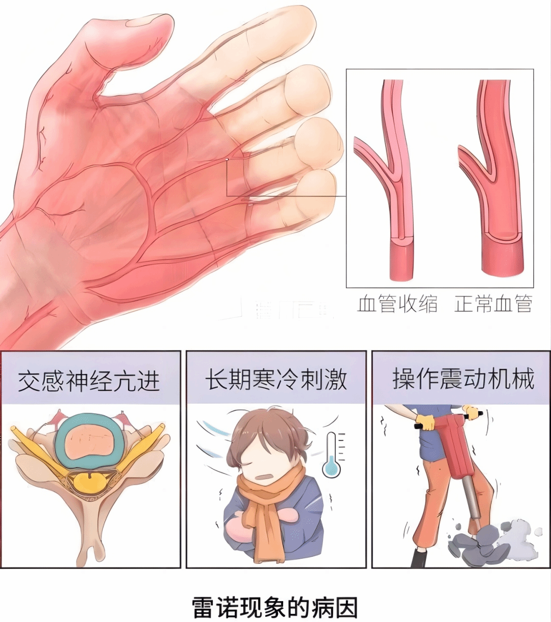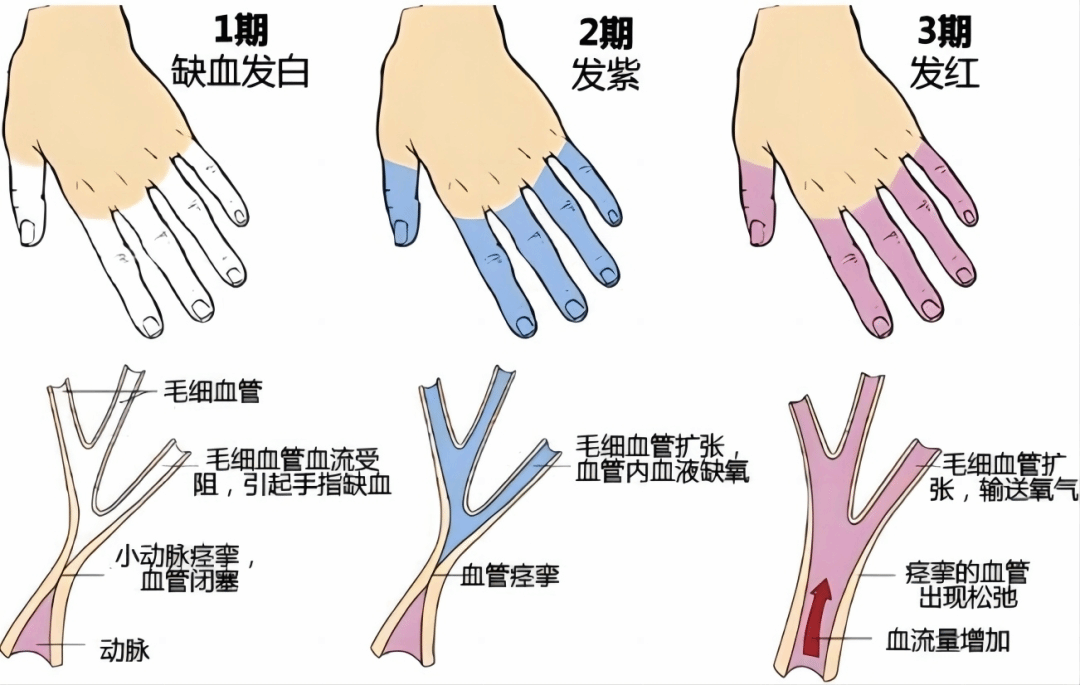 其实,这种情况在医学上被称为“雷诺综合症”或“雷诺现象”,也叫作“肢端动脉痉挛症”,因1862年医学家雷诺首先报道本病而得名。