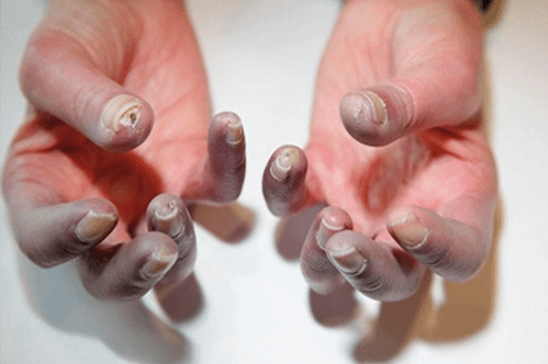 如果雷诺现象反复发作,导致指甲和皮肤营养障碍,会出现手指皮纹减少、皮肤变硬、指腹变薄、指端溃疡和小面积坏疽,常伴有剧烈疼痛,溃疡愈合后可遗留点状皮肤瘢痕。