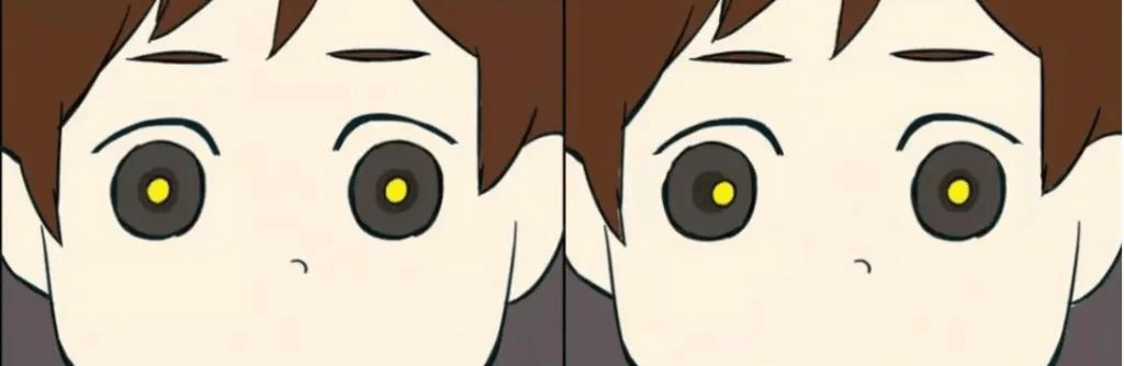 一眼黑眼珠的反光点仍在中央,另一眼由于眼球外飘,黑眼珠的反光点位于内侧。