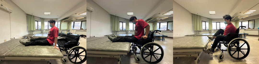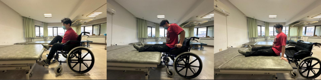轮椅与床垂直→关闭手刹→分别将双腿抱起放于床上→打开手刹→将轮椅向前推进,紧靠床边→关闭手刹→双手放于扶手上→多次撑起上身将臀部向床上移动→摆正双下肢位置。