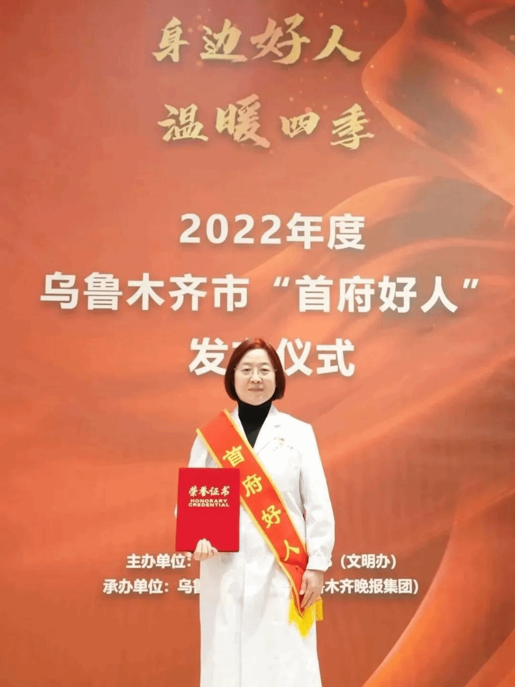 身边好人,温暖四季,2月22日,2022年度乌鲁木齐市“首府好人”发布仪式在乌鲁木齐市文化中心温暖举行。新疆医科大学第一附属医院妇科中心主任马彩玲教授荣获2022年度乌鲁木齐市“首府好人”荣誉称号。