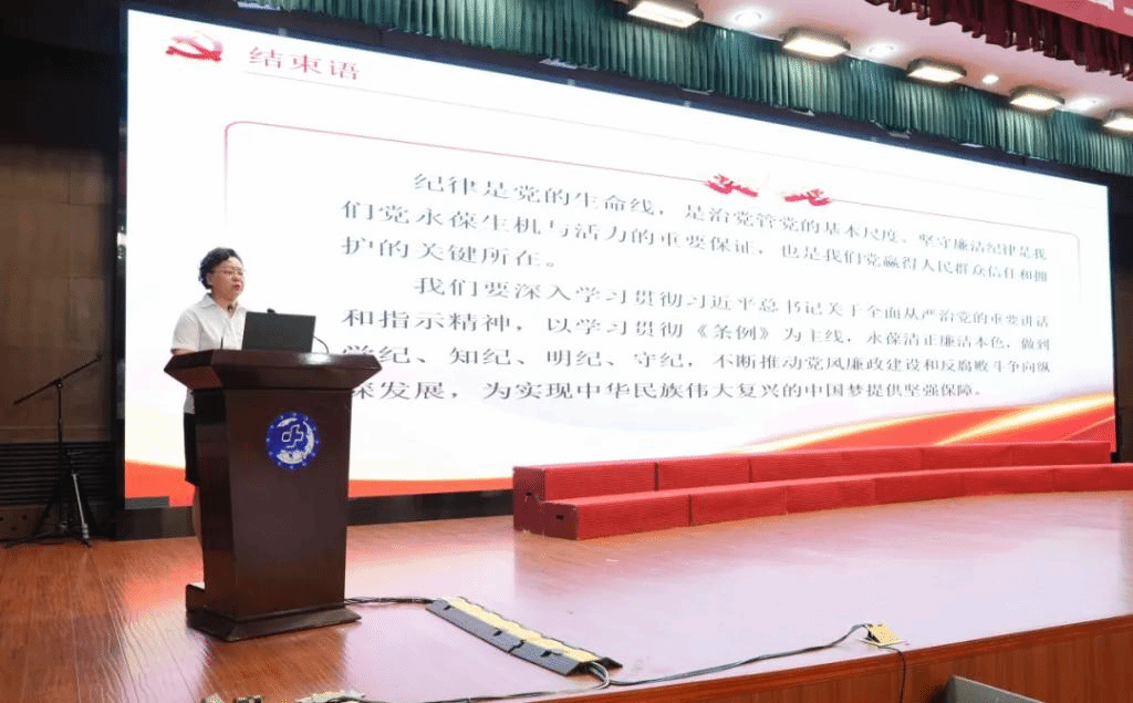 第八党总支书记杨益以“严守党的廉洁纪律 永葆清正廉洁本色”为题,分别从深刻认识严明党的廉洁纪律的重大意义、全面把握《条例》对党的廉洁纪律的新规定、以案释纪,严守党的廉洁纪律等三方面进行微党课领学,同时以警示案例作为党纪学习教育的“活教材”,提醒全体党员明底线、知敬畏,永葆清正廉洁本色,做到学纪、知纪、明纪、守纪。