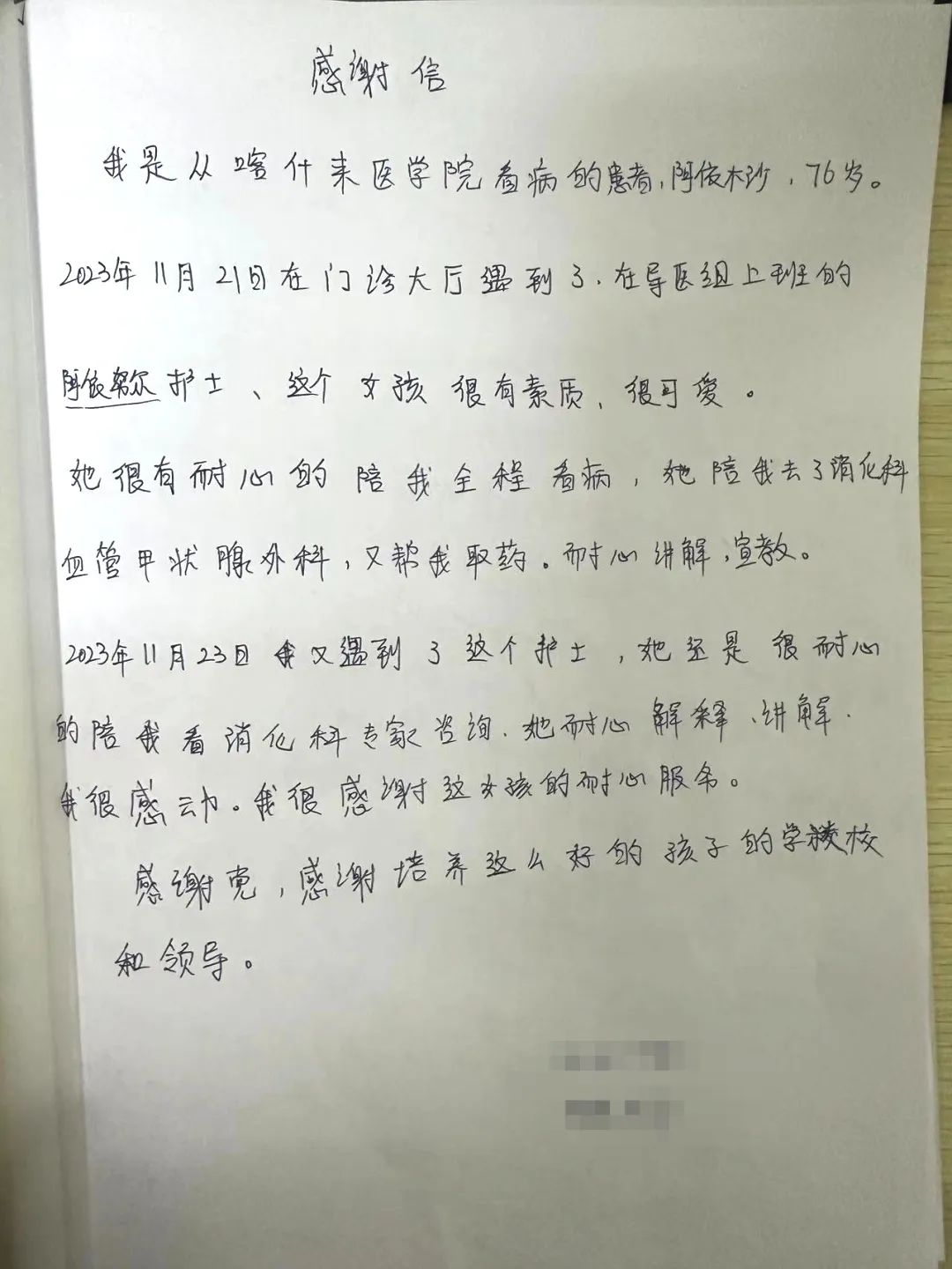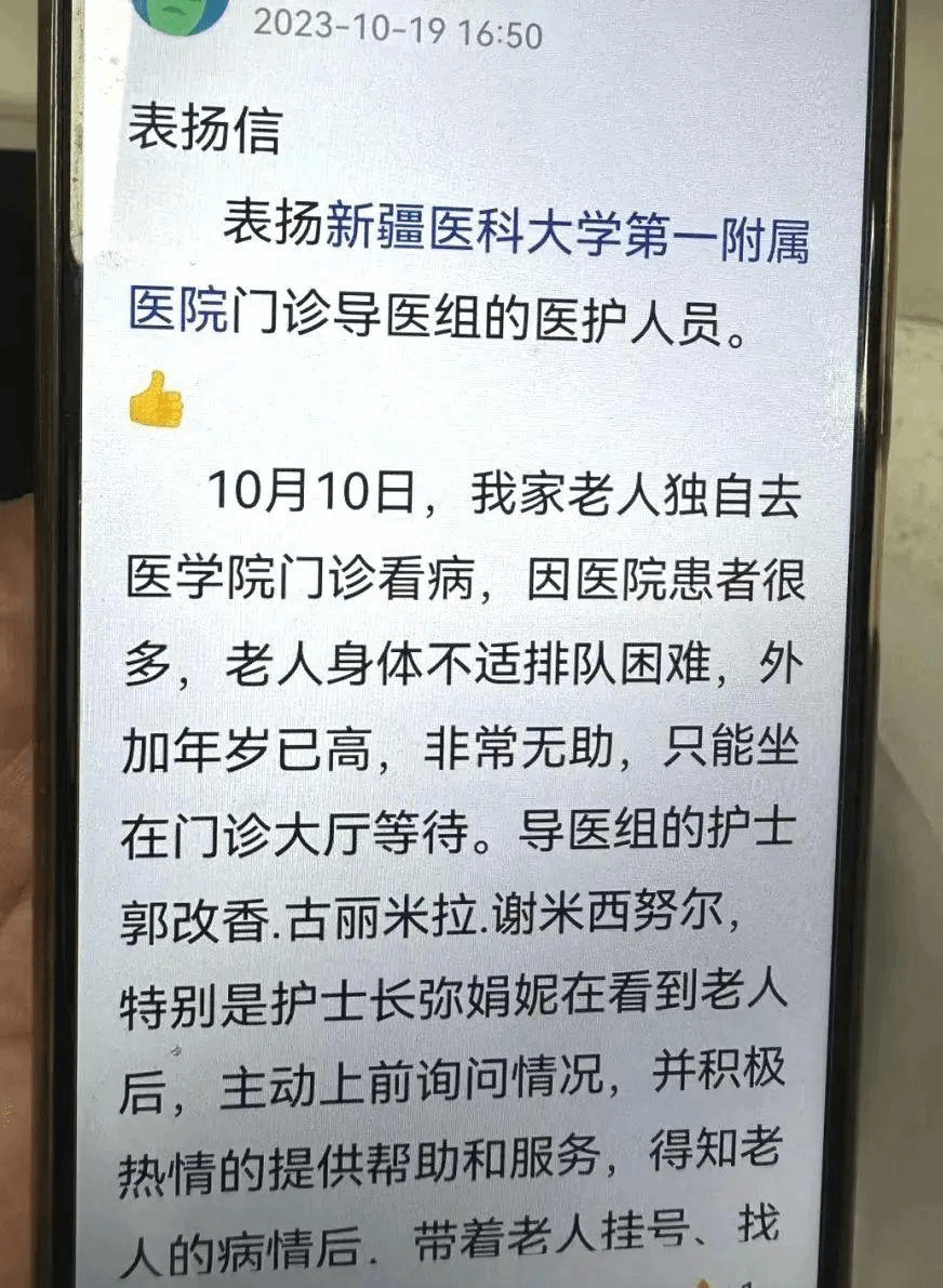 一个周三的上午,只见有个老奶奶颤颤巍巍的跑到收费窗口说要挂号,这时导医护士走来问:“奶奶,有什么需要帮助的么?”奶奶一把抓住护士的手说:“护士我要挂号,我以前是个老师,教过很多学生,现在老了,脑子记不住了,干啥都不行了……”说着说着便哽咽了。导医护士拉起奶奶的手:“没事奶奶,我来帮您”,说着便带她挂号、缴费、看诊、取药……奶奶看病结束临走时说:“姑娘我也没啥感谢你的,走我带你吃个饭吧,表达一下我的感激之情,你真的帮我解决了大问题。”
