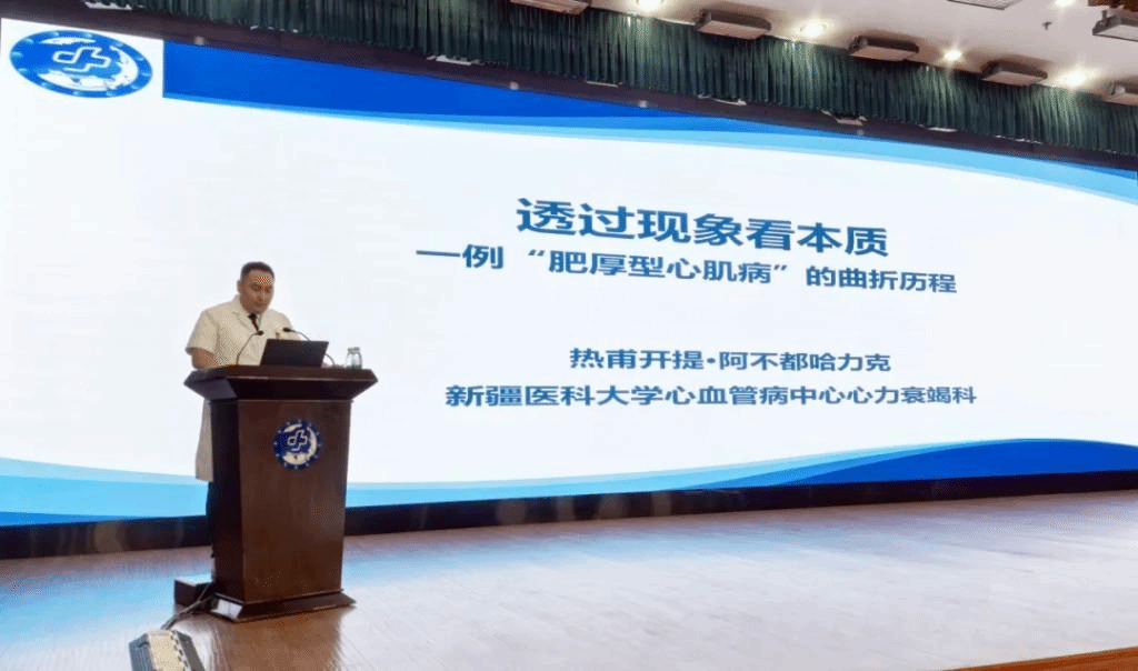 心血管病中心心力衰竭科热甫开提·阿不都哈力克医师以《透过现象看本质--一例“肥厚型心肌病”的曲折历程》为题进行病例分享。案例是一位35岁男性患者,6年前受凉后出现胸闷气短,持续数分钟,多与活动有关,休息后可好转。2018年曾于入院就诊完善心脏B超提示:肥厚性心肌病(非梗阻性),予以琥珀酸美托洛尔23.75mg每日1次口服,此后患者上述不适间断发作。2023年4月症状加重伴下肢浮肿就诊我院急诊完善相关检查后,明确诊断为心力衰竭、肥厚性心肌病(非梗阻性)、心功能Ⅲ级,给予利尿剂、β受体阻滞剂药物治疗,症状好转后出院。此后症状仍频繁加重,多次就诊我院调整方案,效果欠佳。一个月前患者再次出现上述症状,并伴有咳嗽咳痰,遂收住入院进一步诊治。