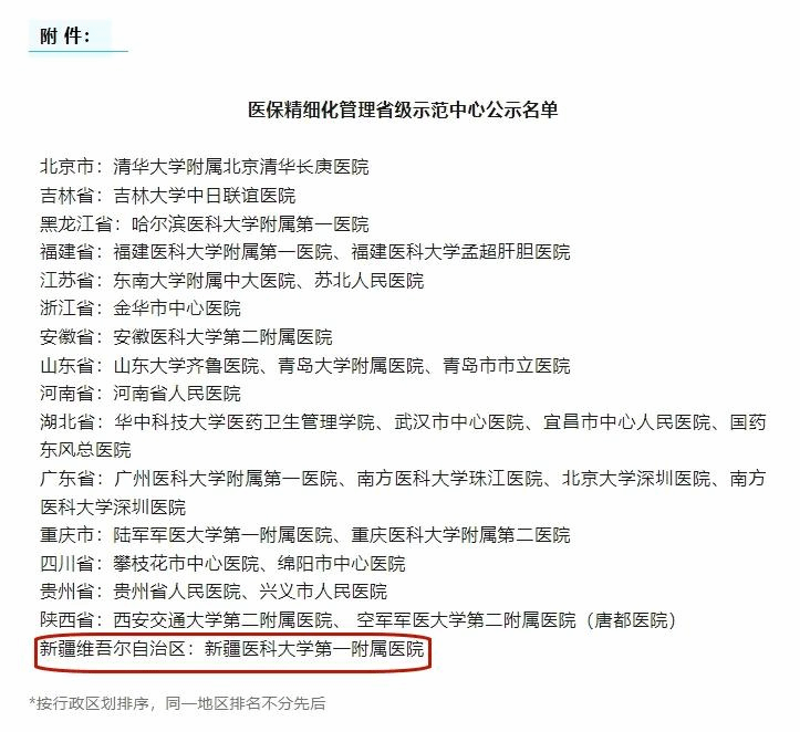 医保精细化管理省级示范中心对医保DRG精细化管理、医疗质量管理及区域影响力等方面提出了严格要求,经组织申报、遴选评审、公示认定三层遴选程序,最终新医大一附院成为新疆唯一入选首批医保精细化管理省级示范中心的医院。