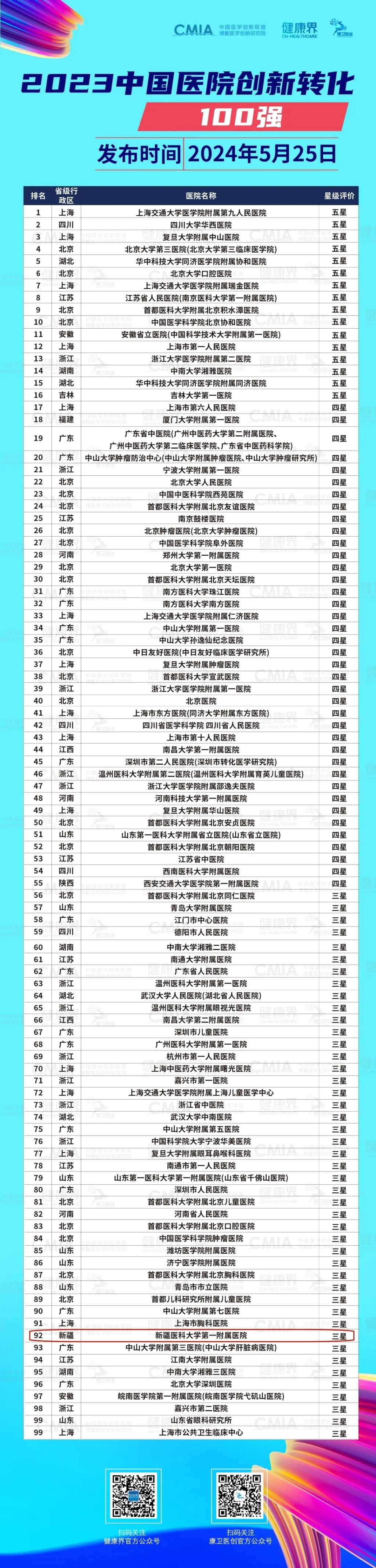 《2023中国医院创新转化100强》榜单评选出五星医院16家、四星医院39家、三星医院45家。新医大一附院被评为三星医院,是新疆唯一一家连续三年登榜的医院。