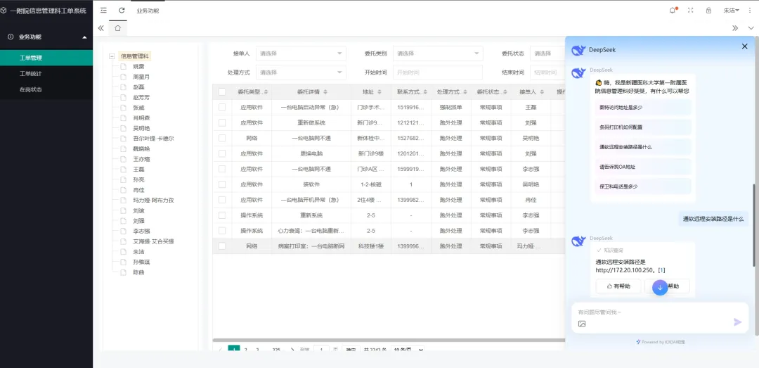 在医院的信息运维与管理方面,DeepSeek-R1大模型同样展现出了巨大的应用价值。信息管理科自主开发的工单系统全面接入DeepSeek,通过收集日常运维中遇到的各类问题,构建了完善的院内知识库。信息管理科的员工只需在工单系统中提出问题,DeepSeek便会结合知识库中的信息,为他们提供个性化、精准化的回答,有效解决了技术难题,提升了运维工作的效率和质量。
