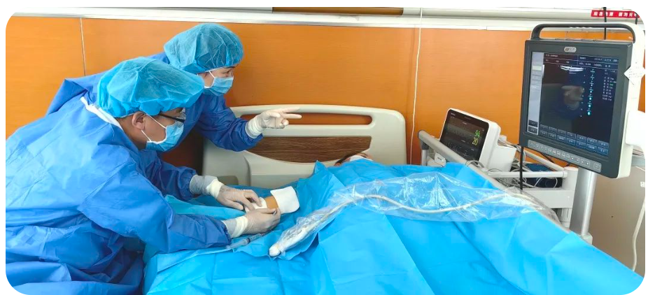 为更好地服务肿瘤患者,在医院医务部、护理部大力支持下,陈瑞护士长联合肿瘤一科有着丰富经验的刘攀副主任,在院内积极开展上臂输液港技术。该项技术术中采用超声引导联合MST技术进行导管植入,术后在床旁采用心腔内电图定位技术,该方法准确率高,可避免患者受放射线的辐射,操作安全简便。