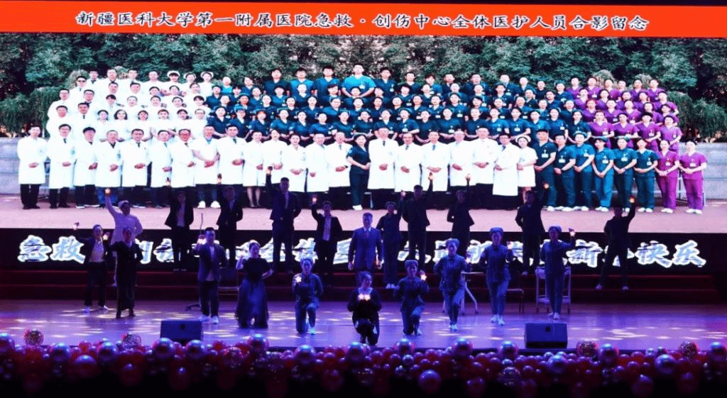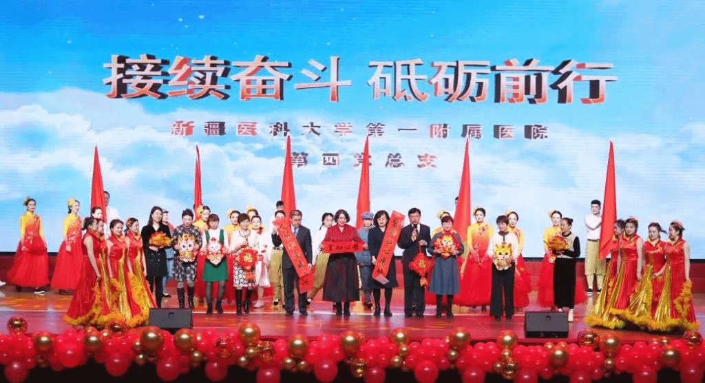 新疆医科大学党委书记赵天杰,医院全体在家院领导、离退休老前辈、援疆专家各科室专家、各共联共建单位代表,患者、家属代表和一线教职工代表欢聚一堂,辞旧迎新,共祝新春。