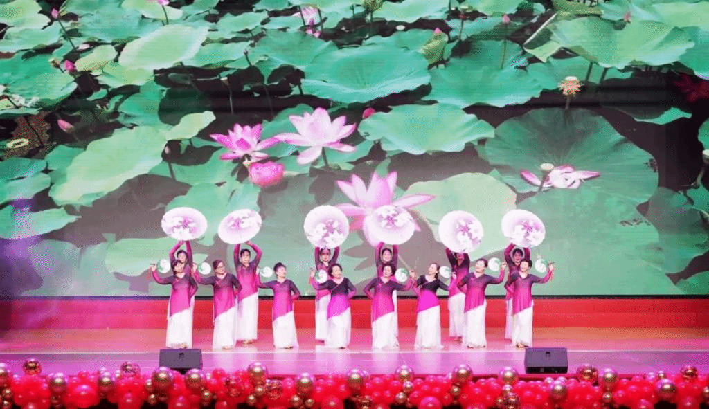 第十五部门工会—离退休职工服务中心白衣天使舞蹈团的离退休职工们的集体舞《荷花颂》,用优美的舞姿展现了一幅荷花春日的生动景象。