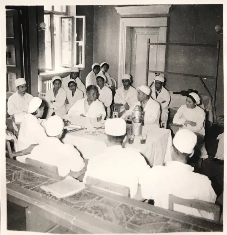 1963年,中山医学院朱师晦教授来院指导交流(桌前右一:李继贤)