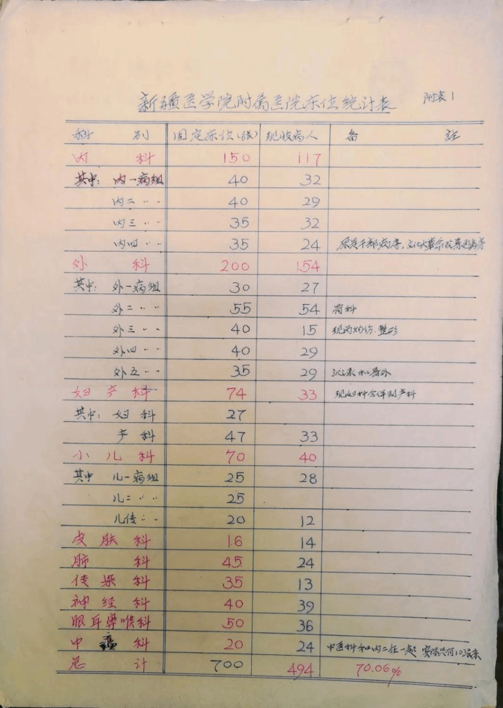 建院初始,医护人员加起来不足150人,当时开设的临床科室10个,内科和外科没有细致划分亚专业。随着医院的发展,细化内科和外科的亚专业迫在眉睫,院党委书记刘之信和院长刘金俚经常深入科室调研,与学科创始人和骨干们探讨内科外科亚专业细化、人才队伍培养规划等问题,顶层设计医院发展规划,科学制定实施人才培养计划,极大地鼓舞了医务人员的工作积极性。到1974年,医院科室细化为20多个临床科室,专业技术人员达近800人,医疗水平得到显著提升,医院在全疆各族群众中信誉和口碑也越来越高。
