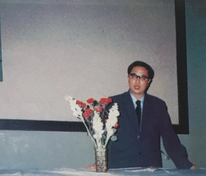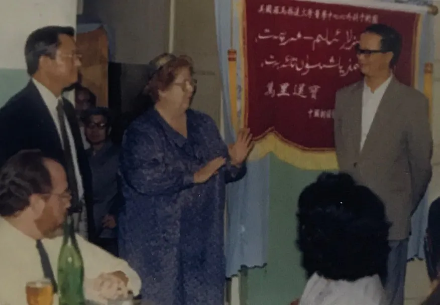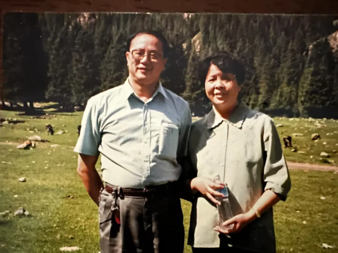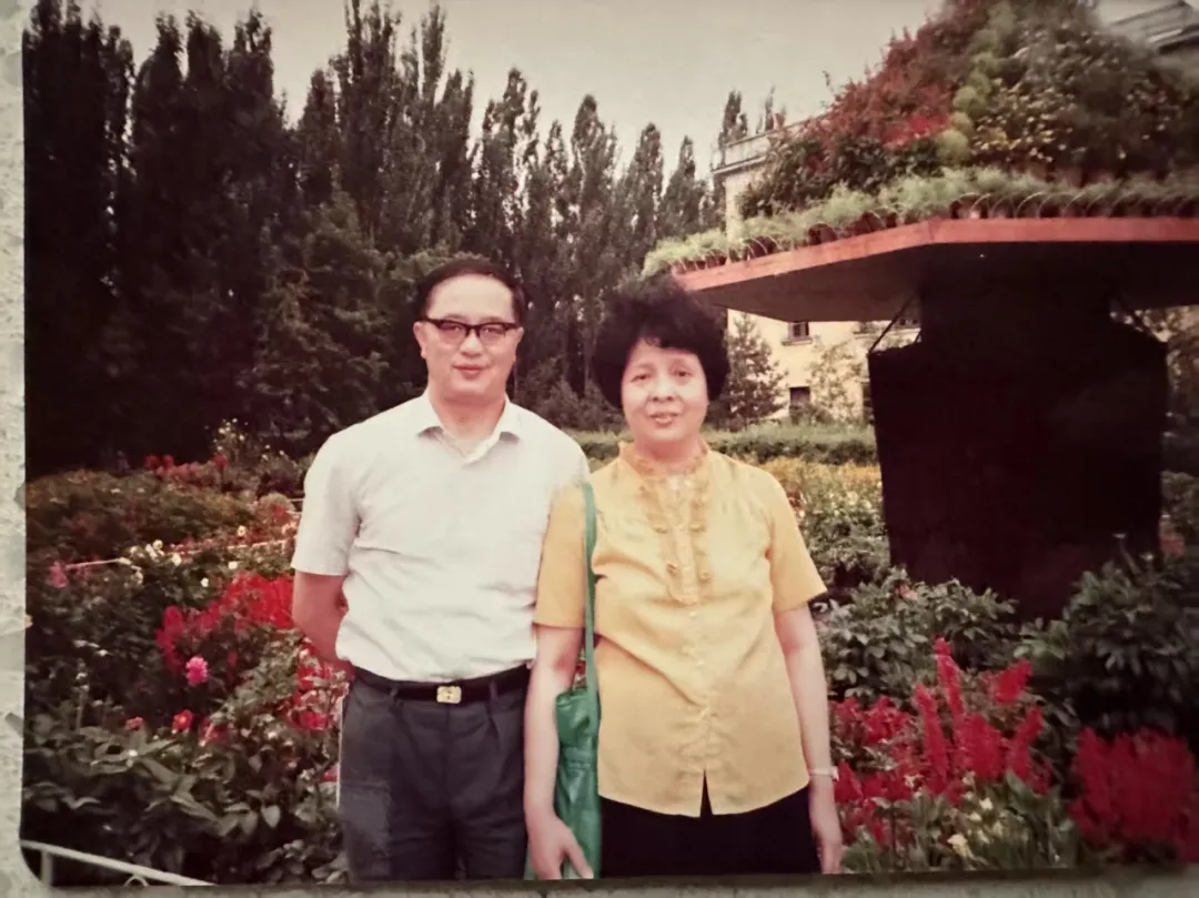 1986年,新疆医学院成立30周年时欧阳甲、黎玉秀在教学楼前广场花坛旁合影