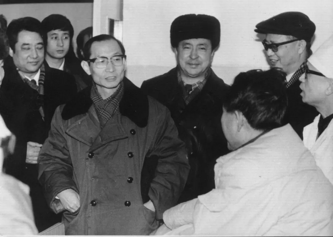 1987年12月,时任卫生部部长陈敏章来院视察工作(右二:欧阳甲)